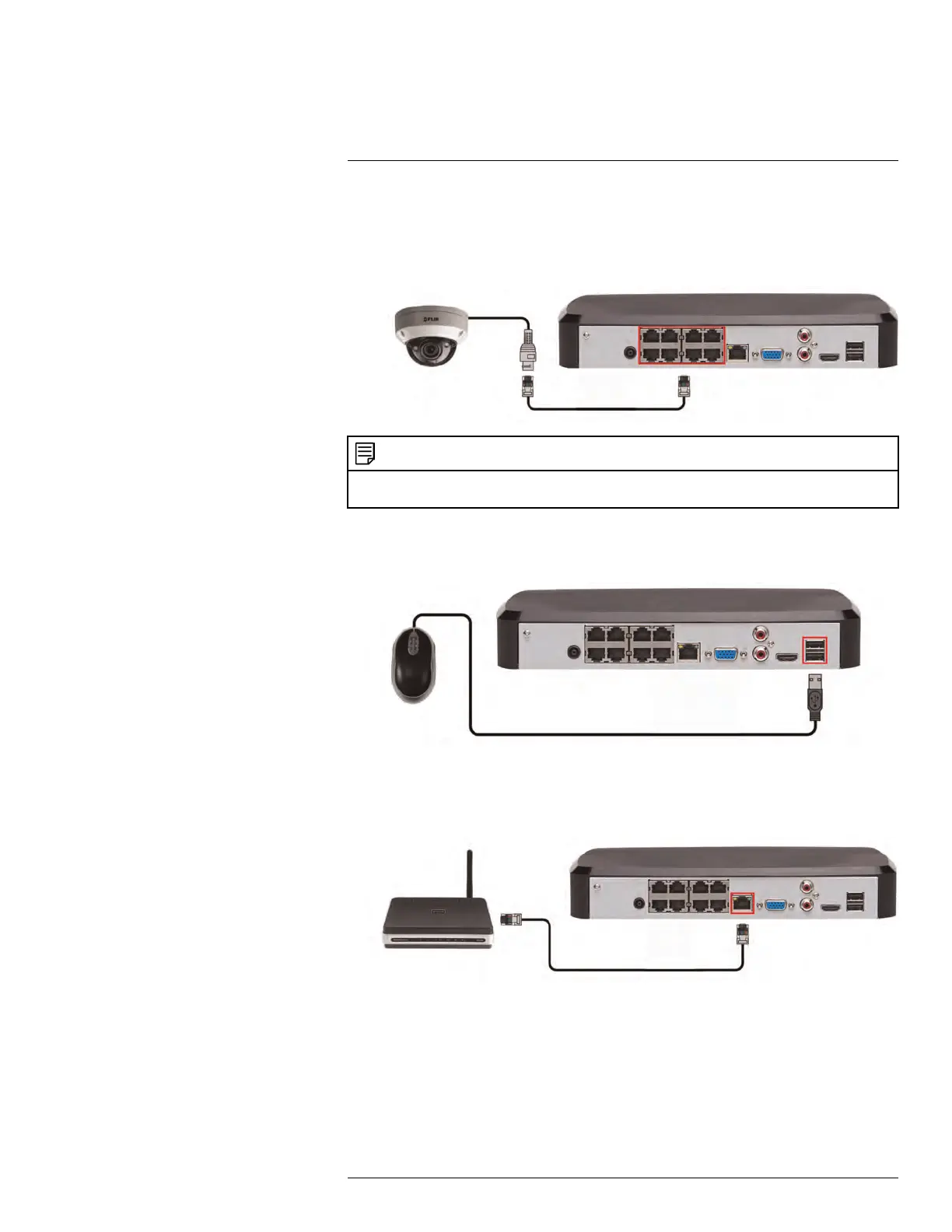 • Connect network cameras to the PoE Ports on the rear panel of the NVR using Cat5e