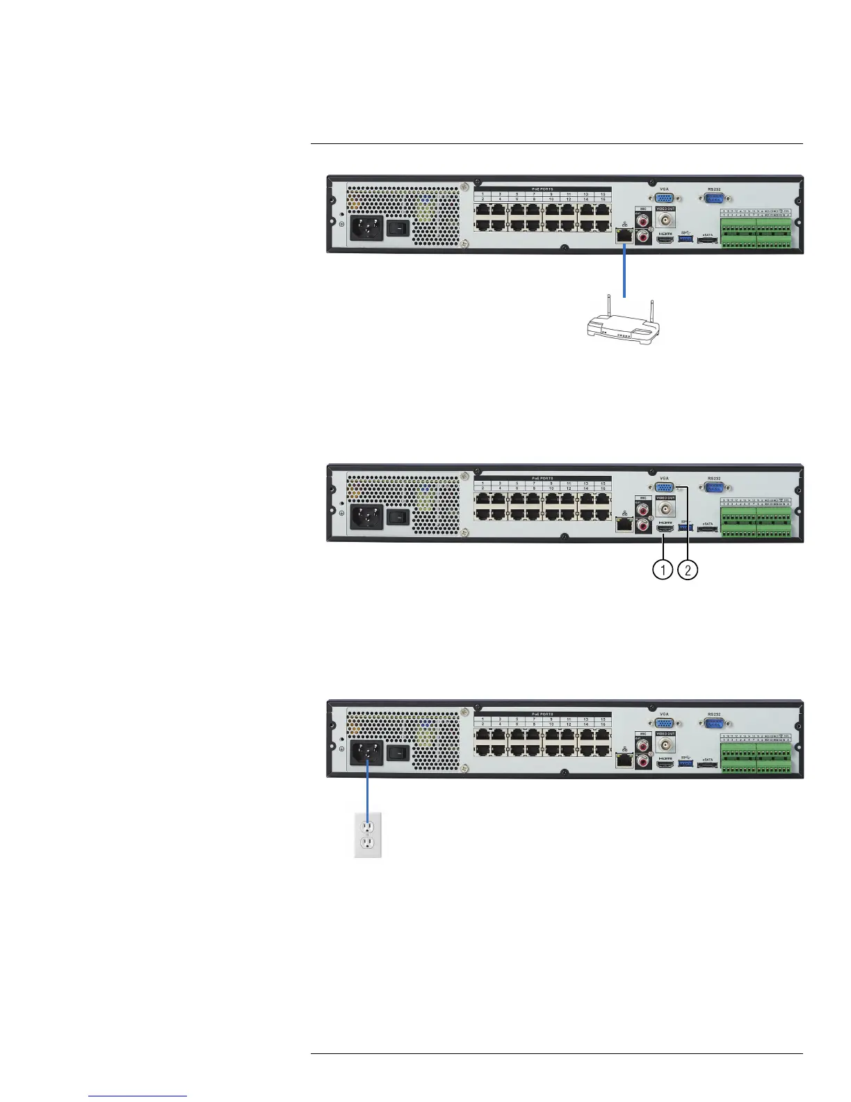• Connect the included AC power cable to the NVR and connect the other end to a power