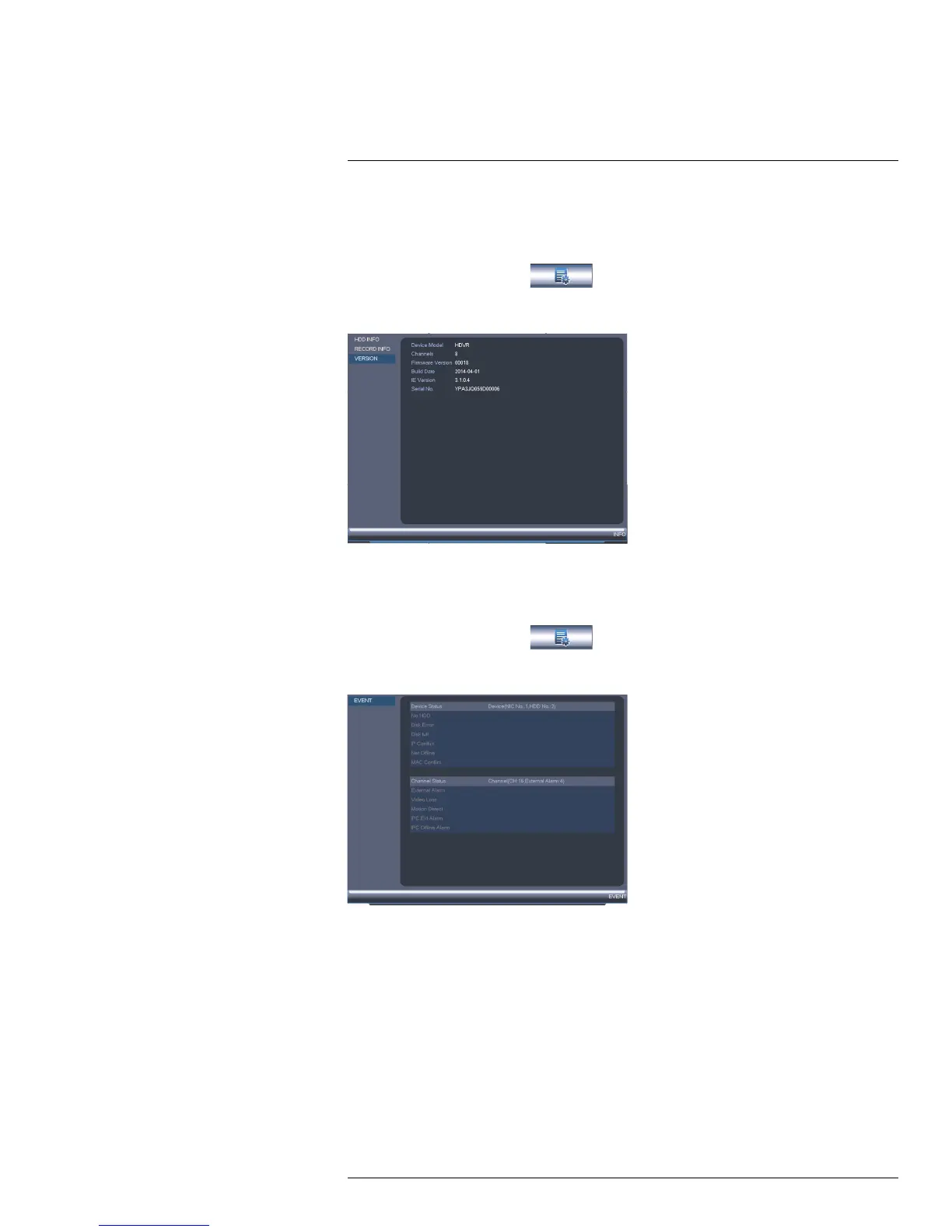 The Event Info menu shows you a display of system alarms. Activated alarms are high-