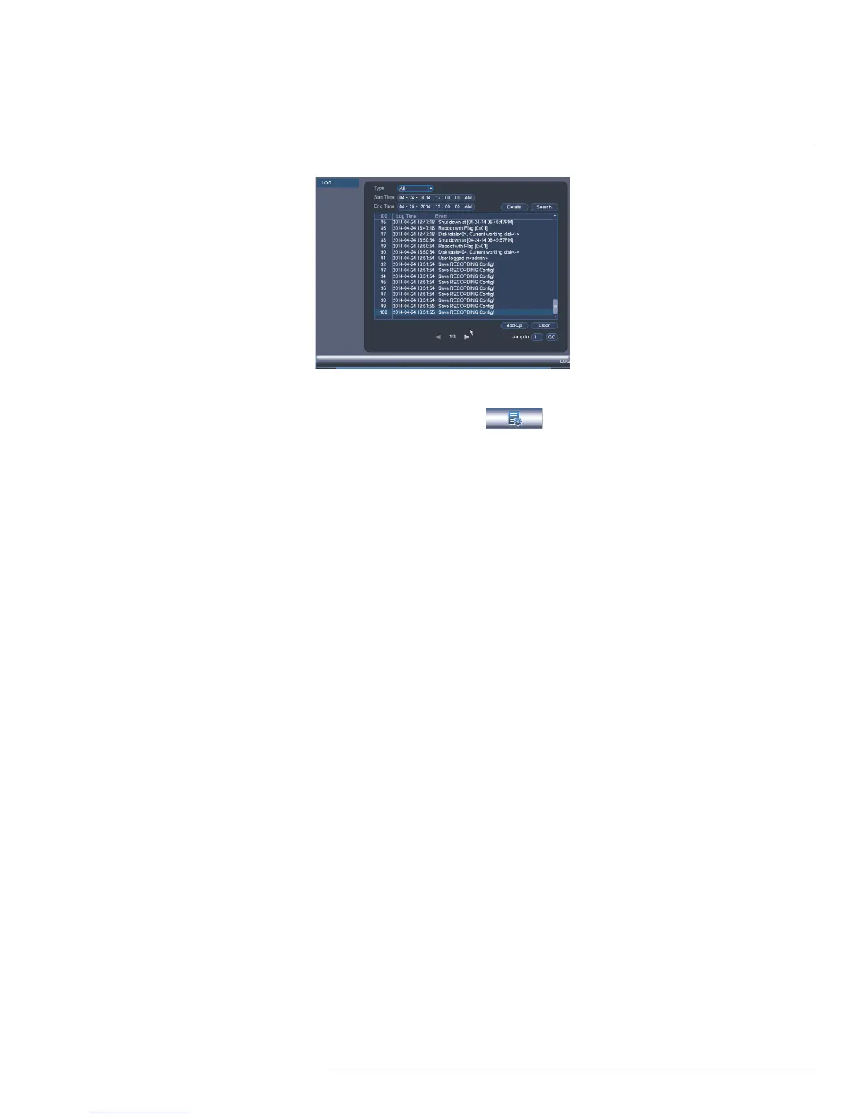 5. (Optional) Click Backup to export logs to a USB thumb drive connected to the system.