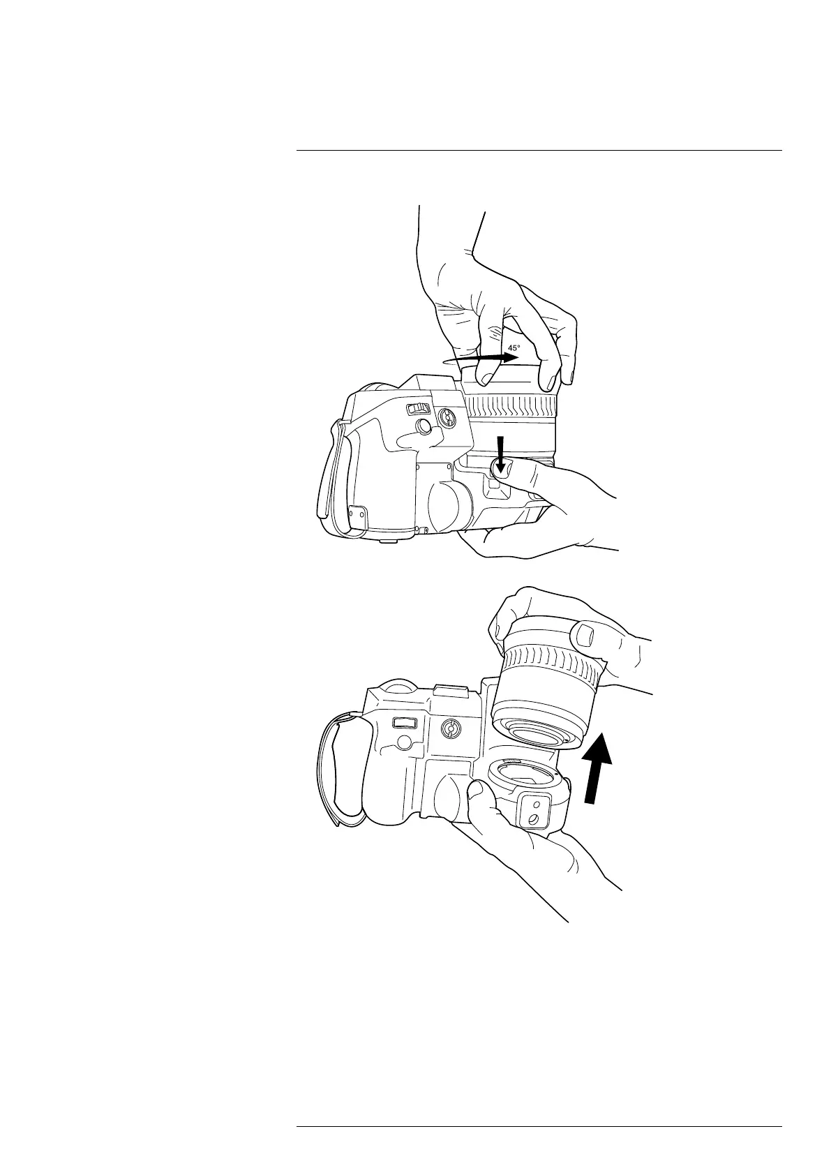 2. Push the release button and rotate the lens 45° counter-clockwise.