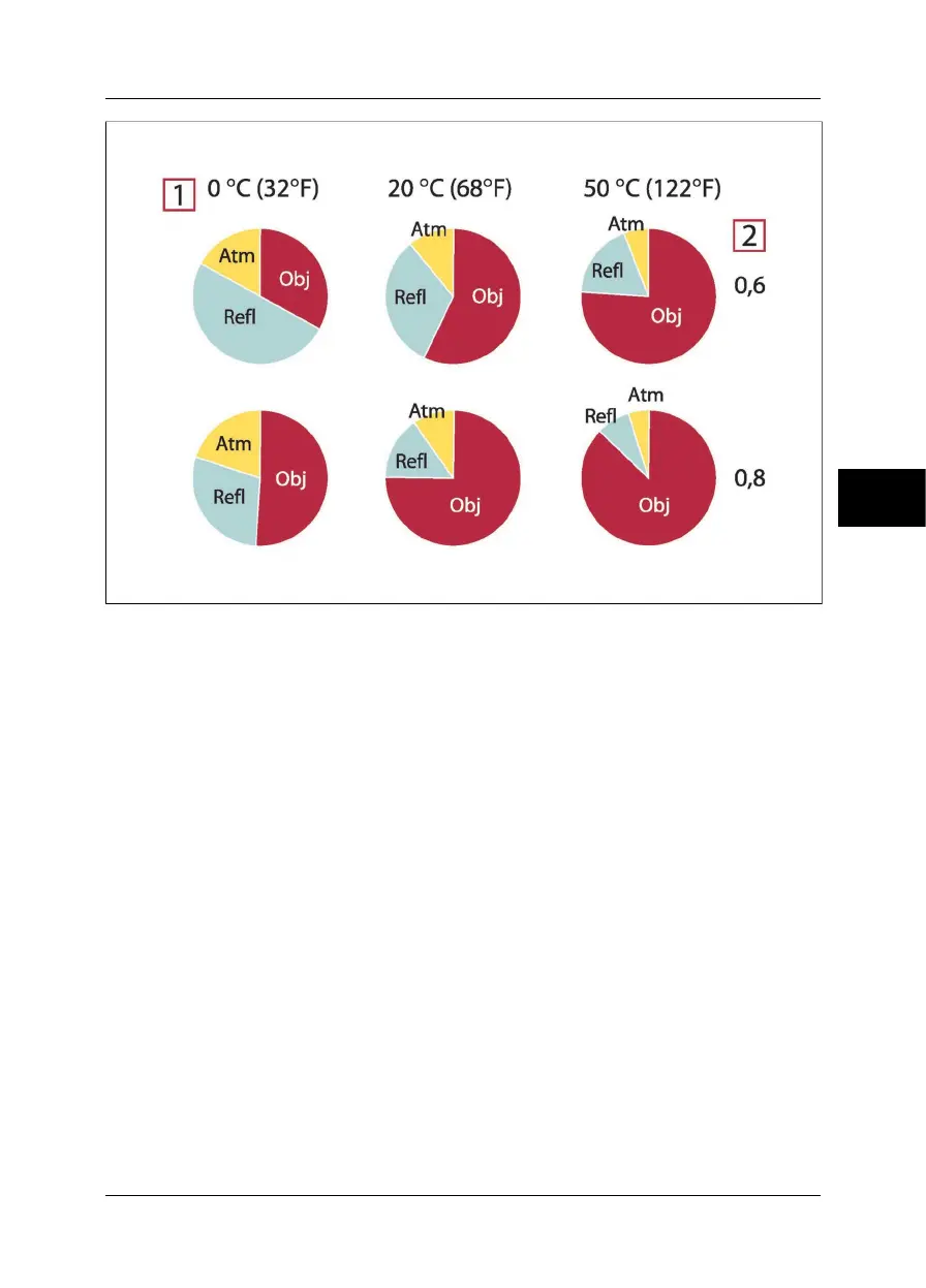 1: Object temperature; 2: Emittance; Obj: Object radiation; Refl: Reflected radiation; Atm: atmosphere