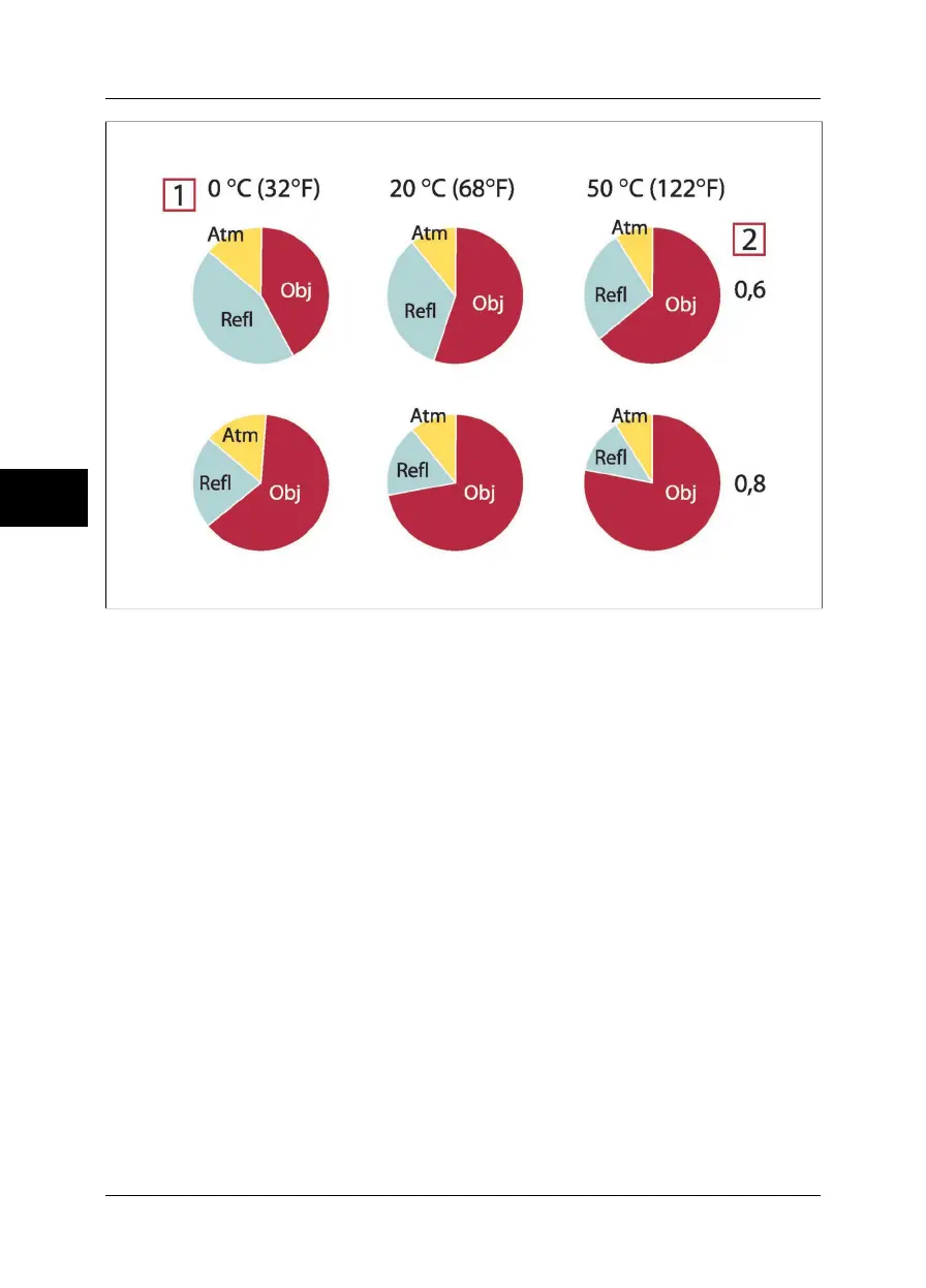 1: Object temperature; 2: Emittance; Obj: Object radiation; Refl: Reflected radiation; Atm: atmosphere