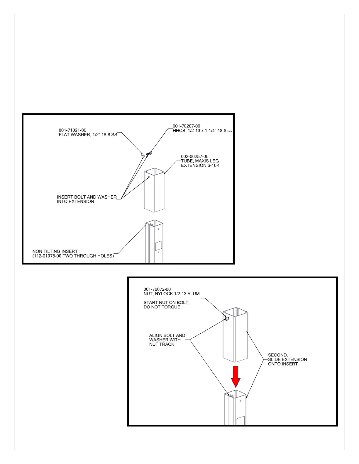 INSTALL (1) ½” X 1 1/4” BOLT AND (1) ½” WASHER INTO EXTENSION TUBE. NOTE THAT THE