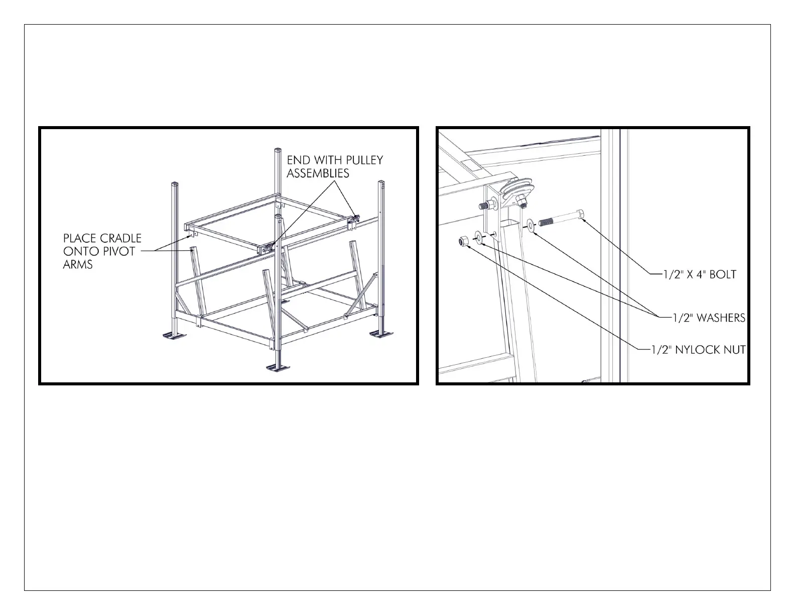 ATTACH THE CRADLE TO THE FRONT AND REAR PIVOT ARMS USING (1) 1/2” X 4” BOLT, (2) 1/2” WASHERS,