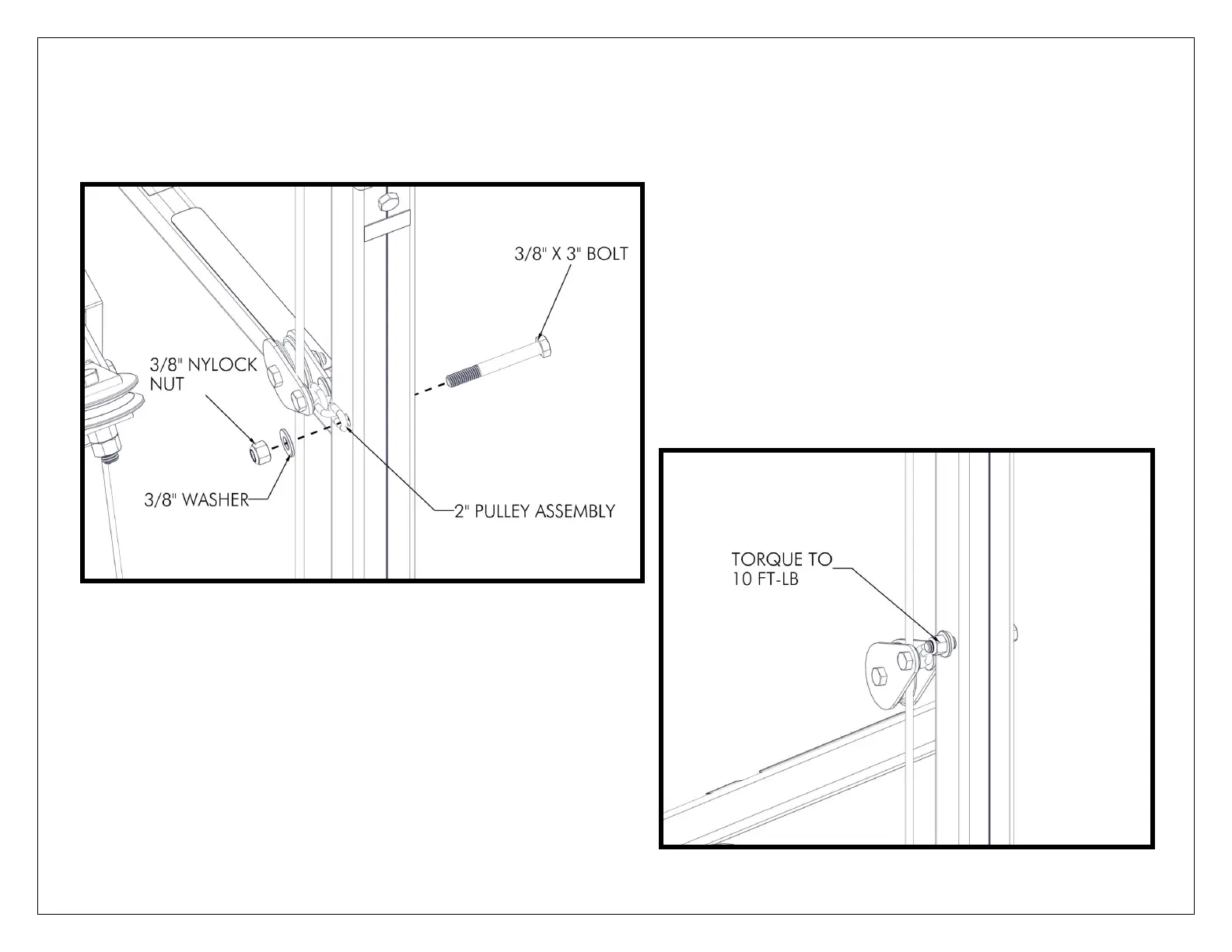 ATTACH 2” PULLEY ASSEMBLY TO THE LEFT SIDE FRAME BEAM WELDMENT WITH (1) 3/8” X 3” BOLT, (1) 3/8”