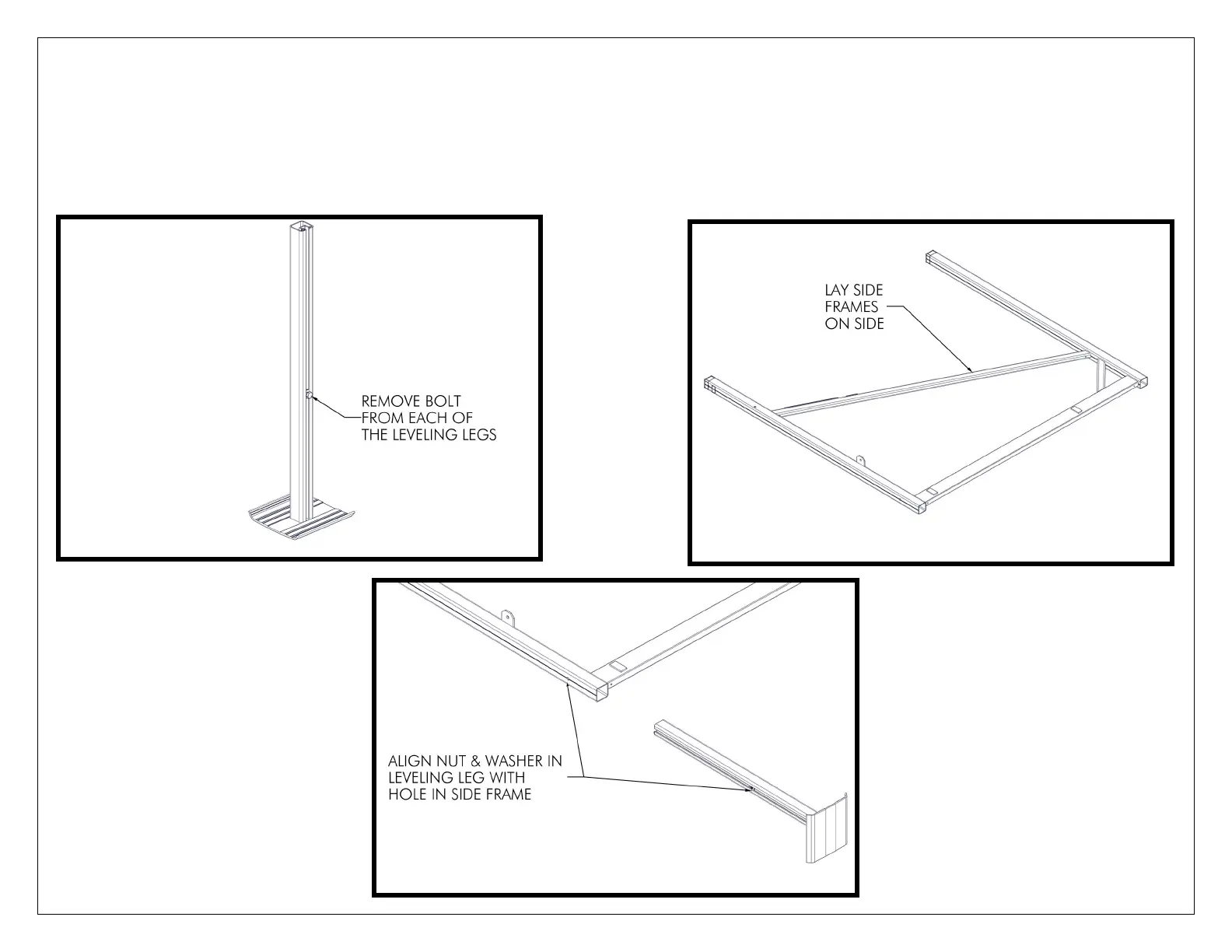 REMOVE THE 3/8” X 3/4” BOLT FROM EACH OF THE LEVELING LEGS (FIGURE 1.1). LAY SIDE FRAMES ON