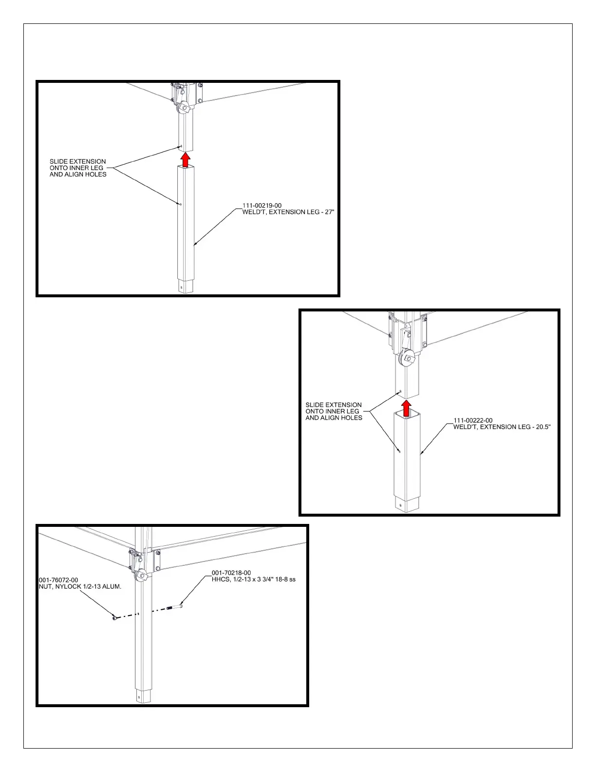 SLIDE LEG EXTENSIONS ONTO INNER LEGS AND ALIGN HOLES (FIGURE 1.5: SMALL LIFTS, FIGURE 1.5A: