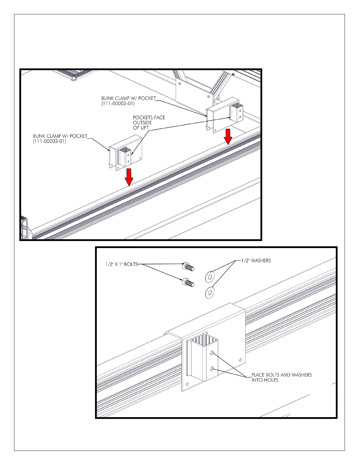 OUTWARDS (FIGURE 1.2). PLACE (2) 5/8” X 1” BOLTS AND (2) ½” WASHERS INTO EACH POCKET (FIGURE
