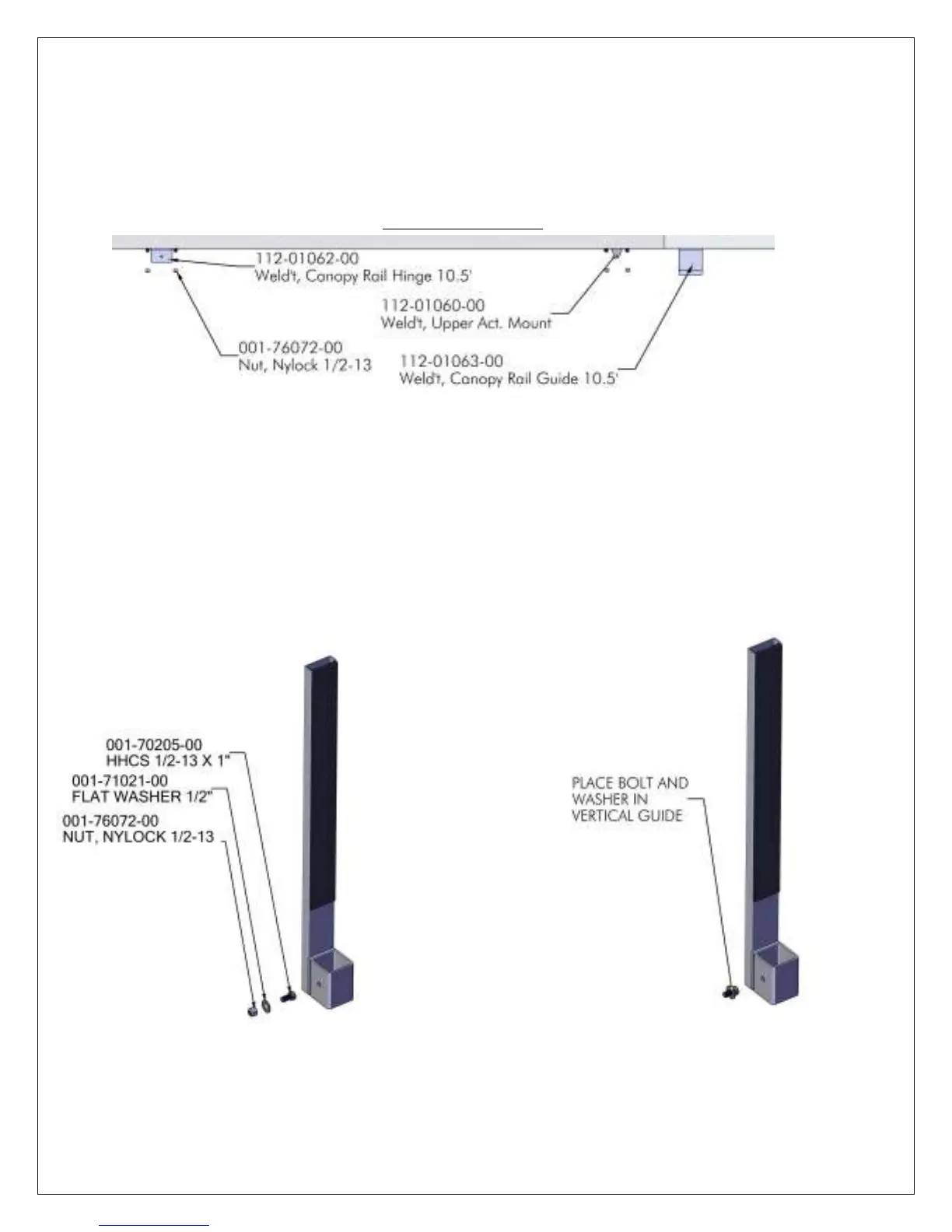 ATTACH ALL UPPER BRACKETS TO CANOPY RAILS AS SHOWN BELOW. PLACE ½-13