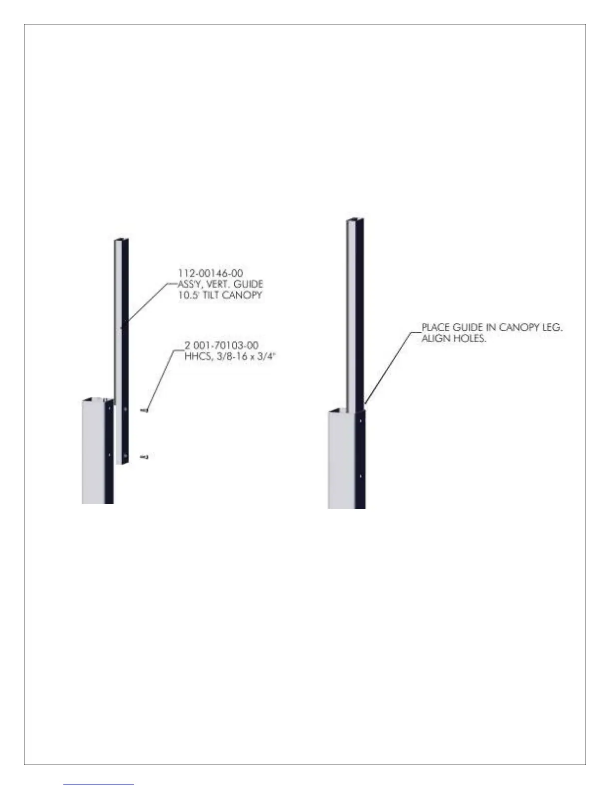 PLACE CANOPY VERTICAL GUIDES INTO REAR CANOPY LEGS AND ALIGN HOLES.