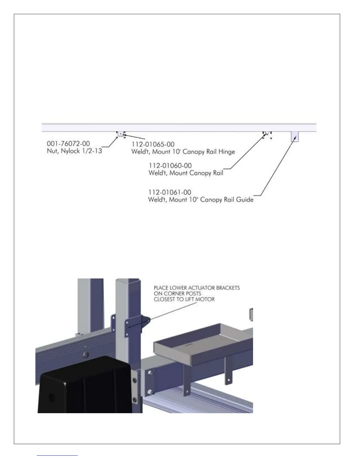 HINGE BRACKET ON CANOPY RAIL WILL BE POSITIONED OVER OPPOSITE CORNER