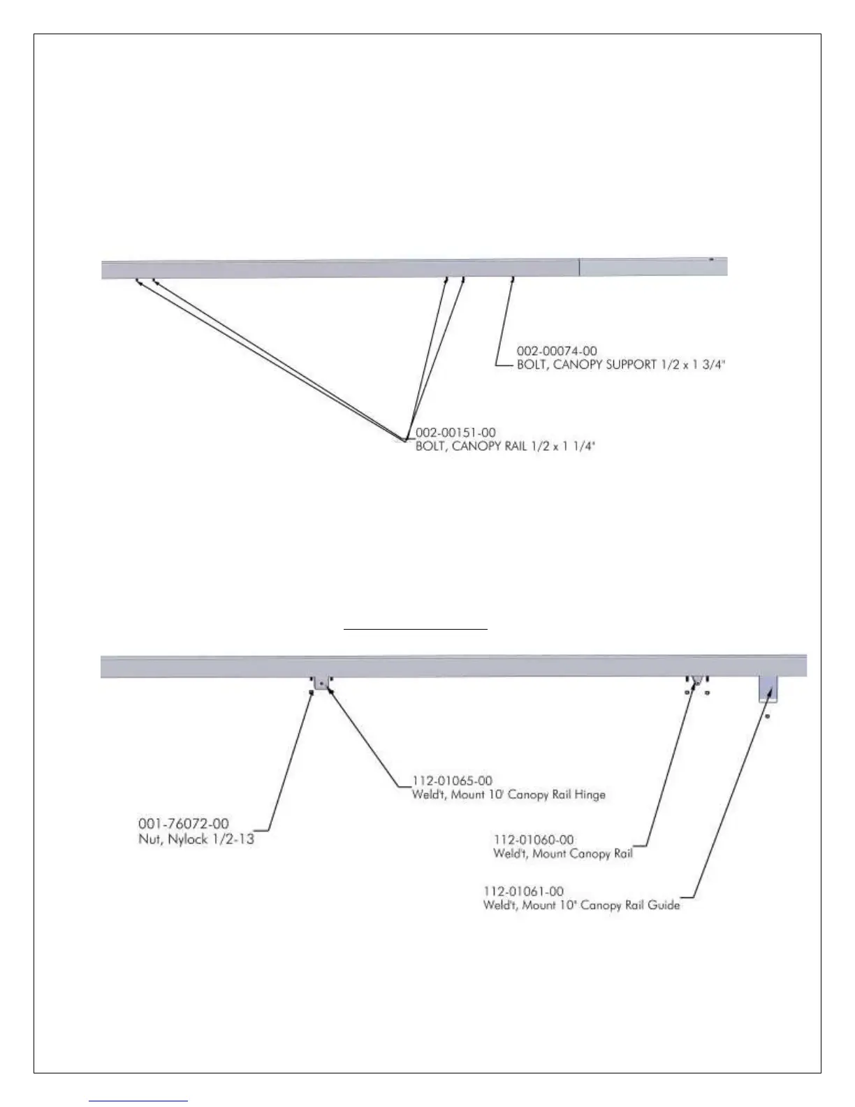 ATTACH ALL UPPER BRACKETS TO CANOPY RAILS AS SHOWN BELOW. PLACE ½-13