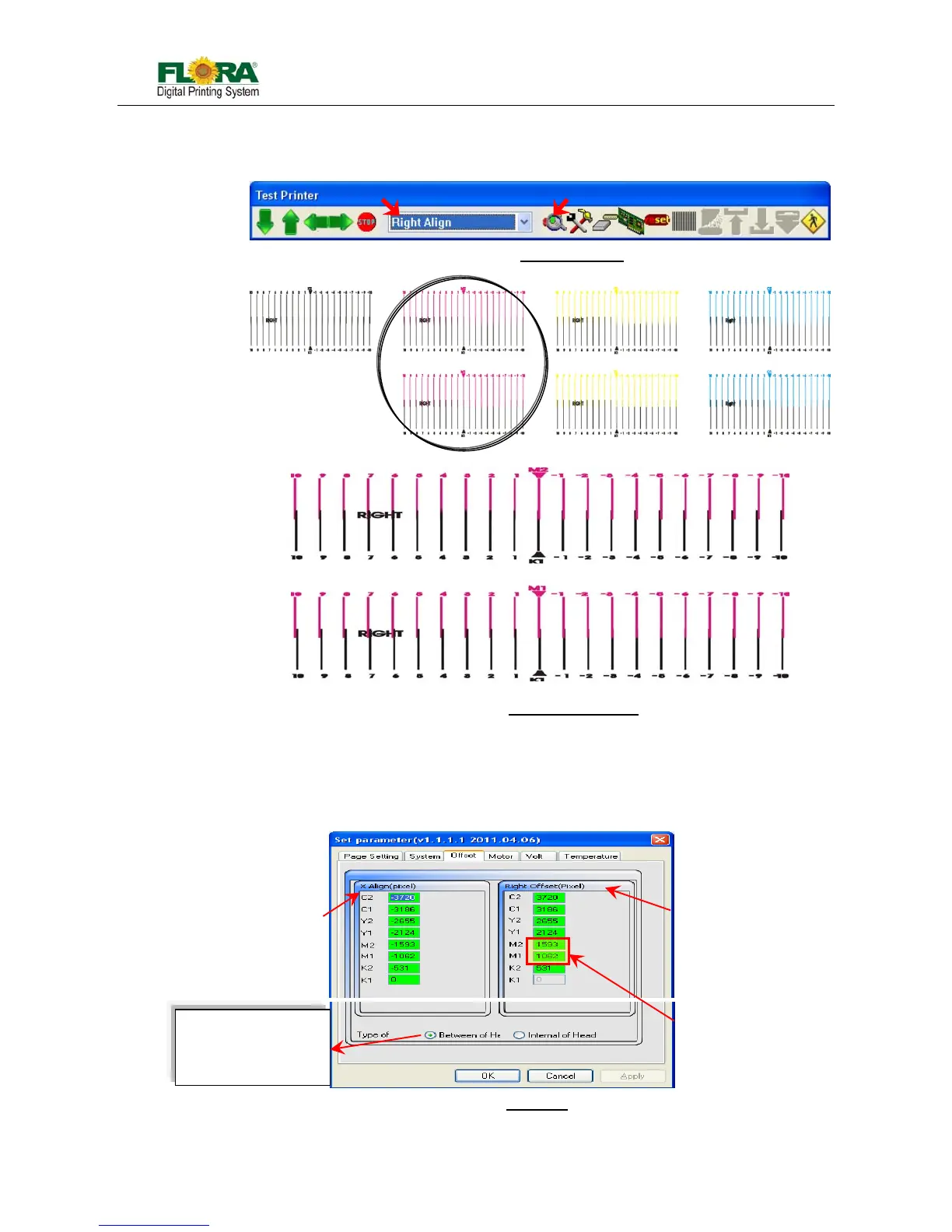 I take M print head as example. K1 meets M1 at “- 4 position” (in green circle), M2