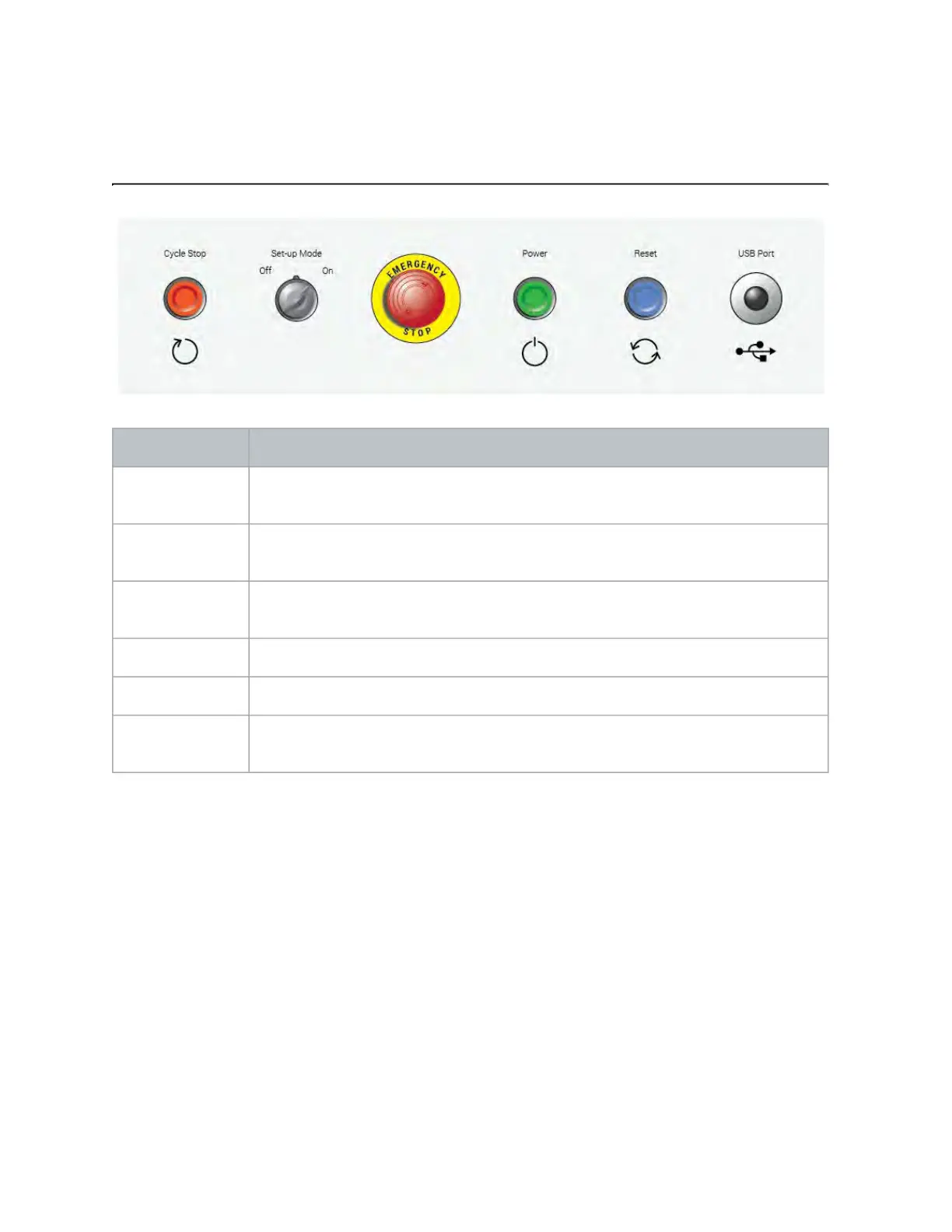 Emergency stop Disables the drives, and stops the high-pressure water stream, abrasive flow,