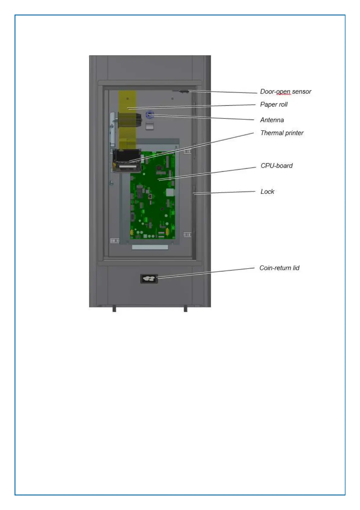 Figure 28, Cabinet interior with CPU board 0501-E0150 and GEBe printer. The printer is mounted on the