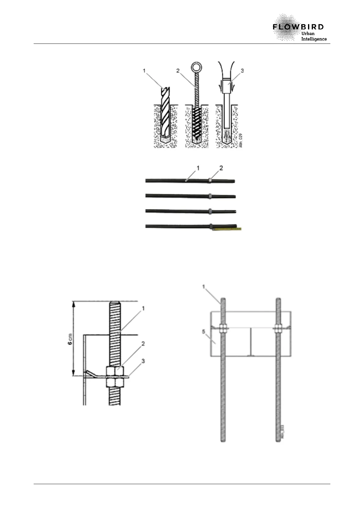E. Insert the threaded rods (1) in the base (5) or in the optional drilling template and fix