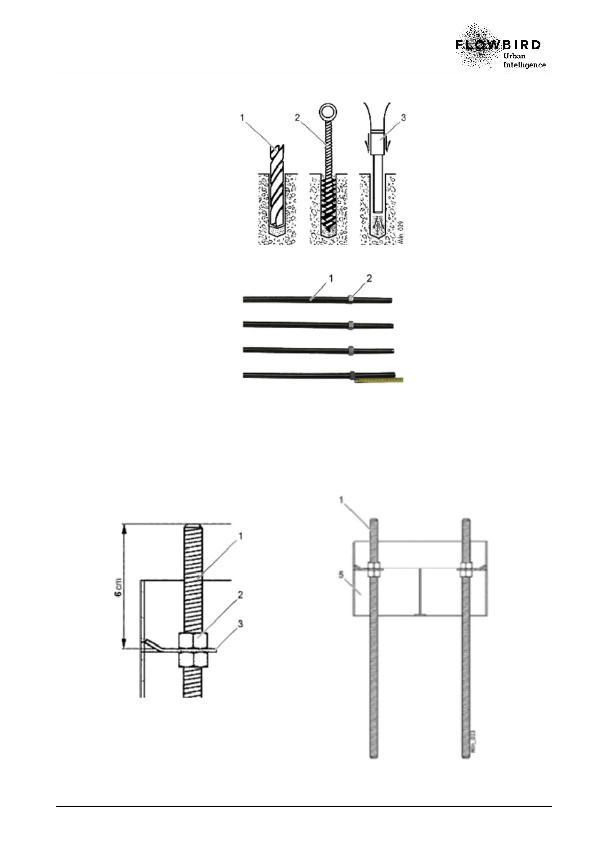 D. Screw a M16 nut (2) up to 6 cm from the end of each anchor rod (1).