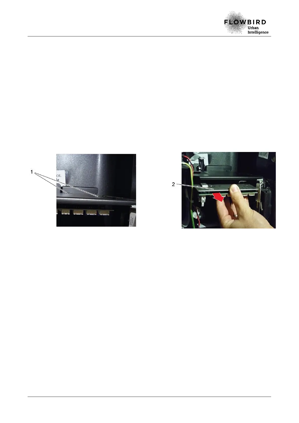 B. Loosen the 2 screws (1) holding the support / attack detection board assembly to