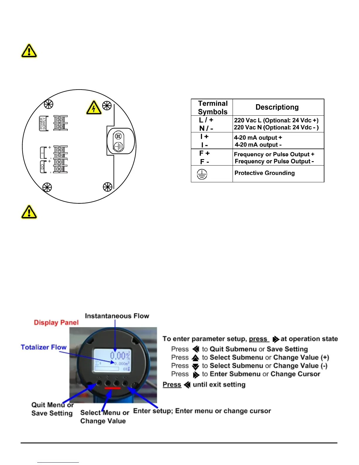 Warning: The mag flow meter is powered by EITHER 220Vac OR 24V DC. Please use