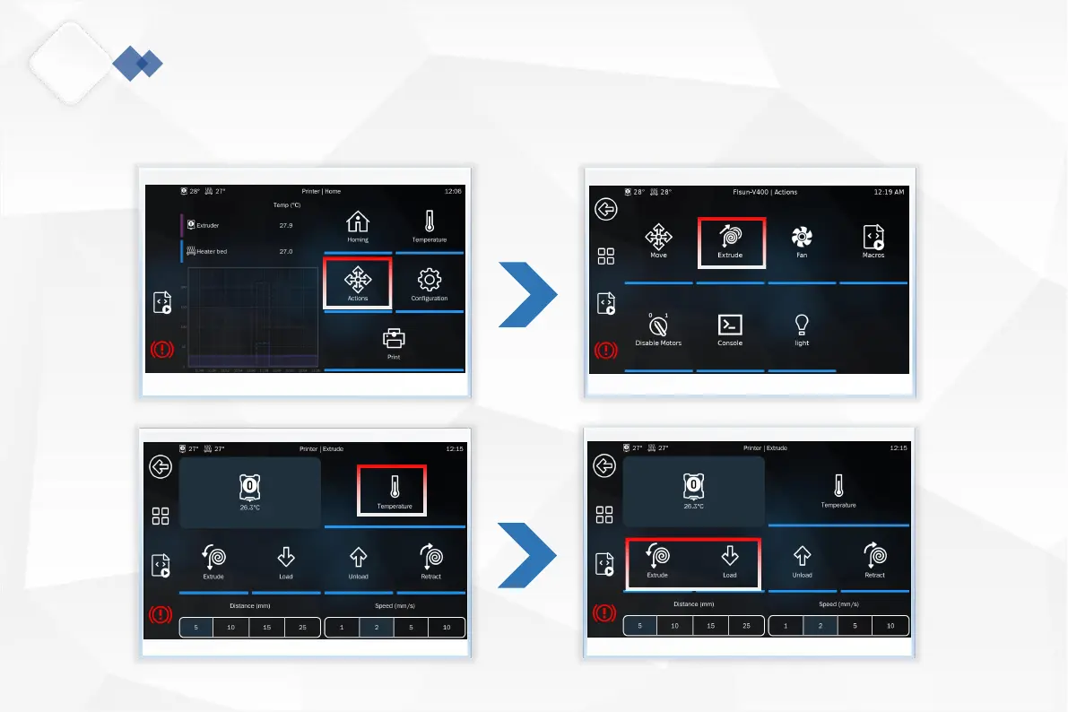 1. Click "Actions>Extrude>Temperature" on the screen, set the nozzle temperature above 180°C, and return to the