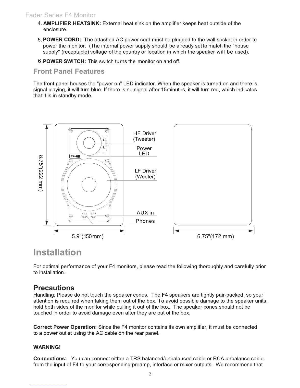 Fluid Audio F4 - Front Panel and Installation Precautions; Front Panel Features; Installation Precautions