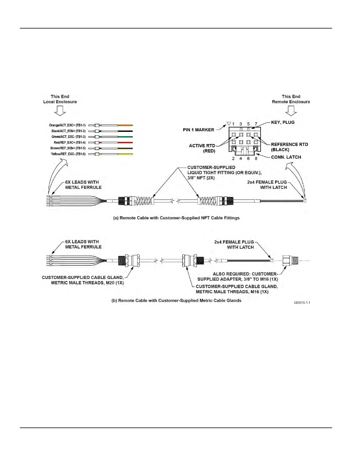 The customer is to supply the appropriate NPT or metric cable fittings for the remote cable. The cable end terminated in a 2x4 female