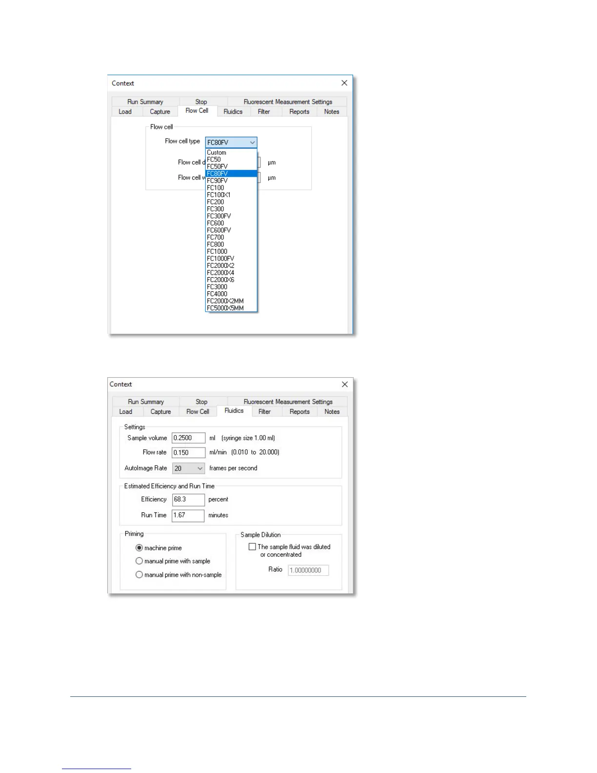 7. The Fluidics tab is where you define the sample volume, flow rate, autoimage rate, efficiency,