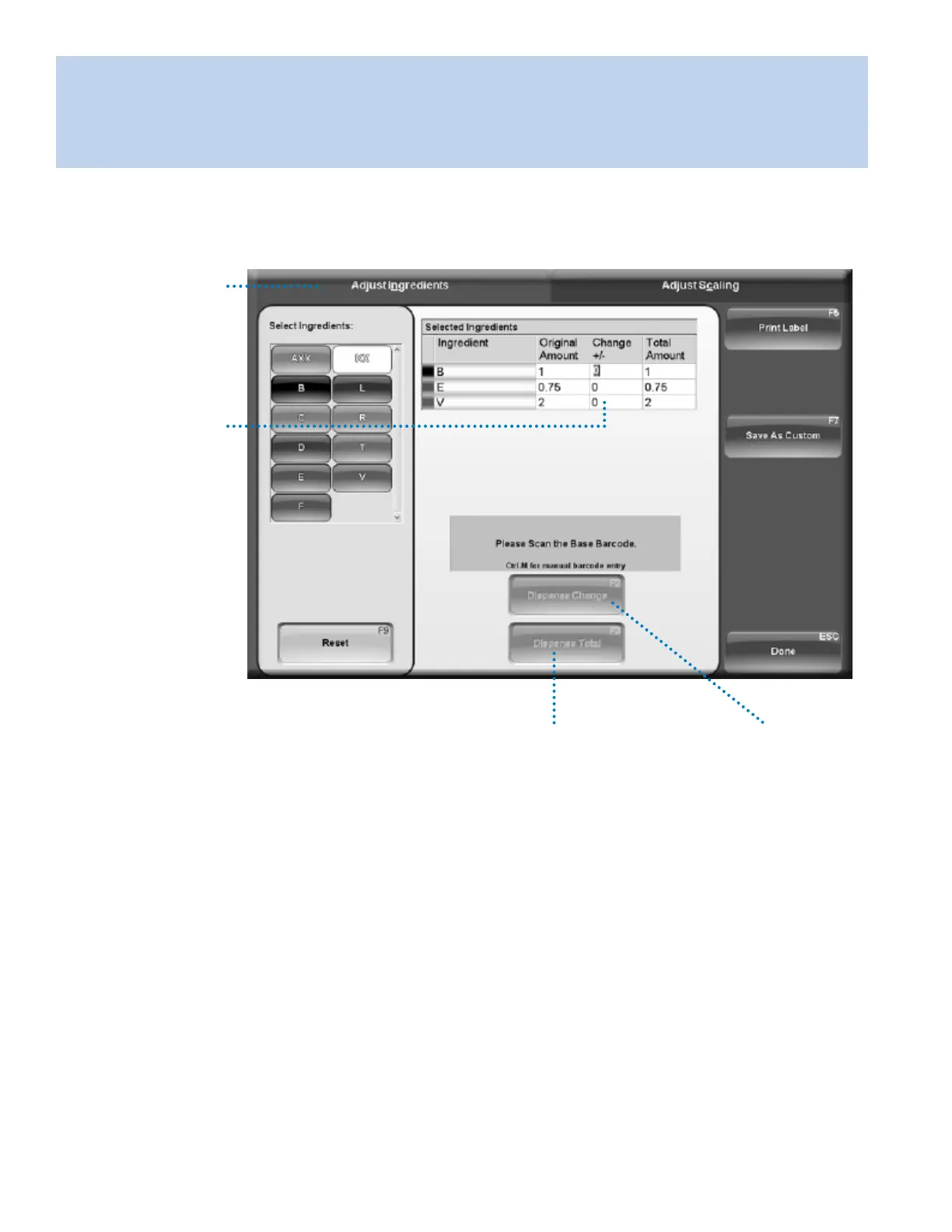 the Dispense Menu, click Adjust (F6) after a formula is selected.