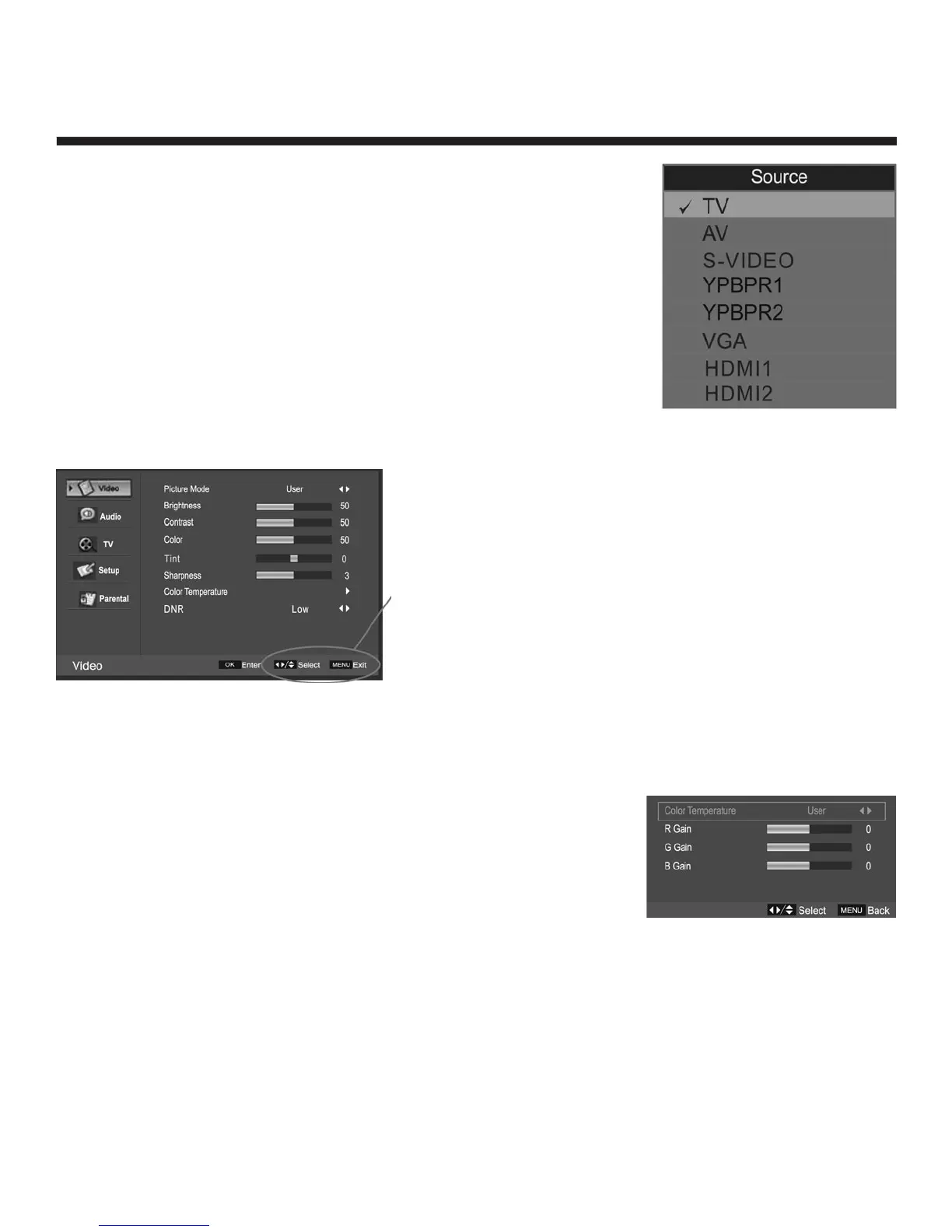 Then press e / d to select the “R Gain, G Gain, B Gain” in “User” mode.