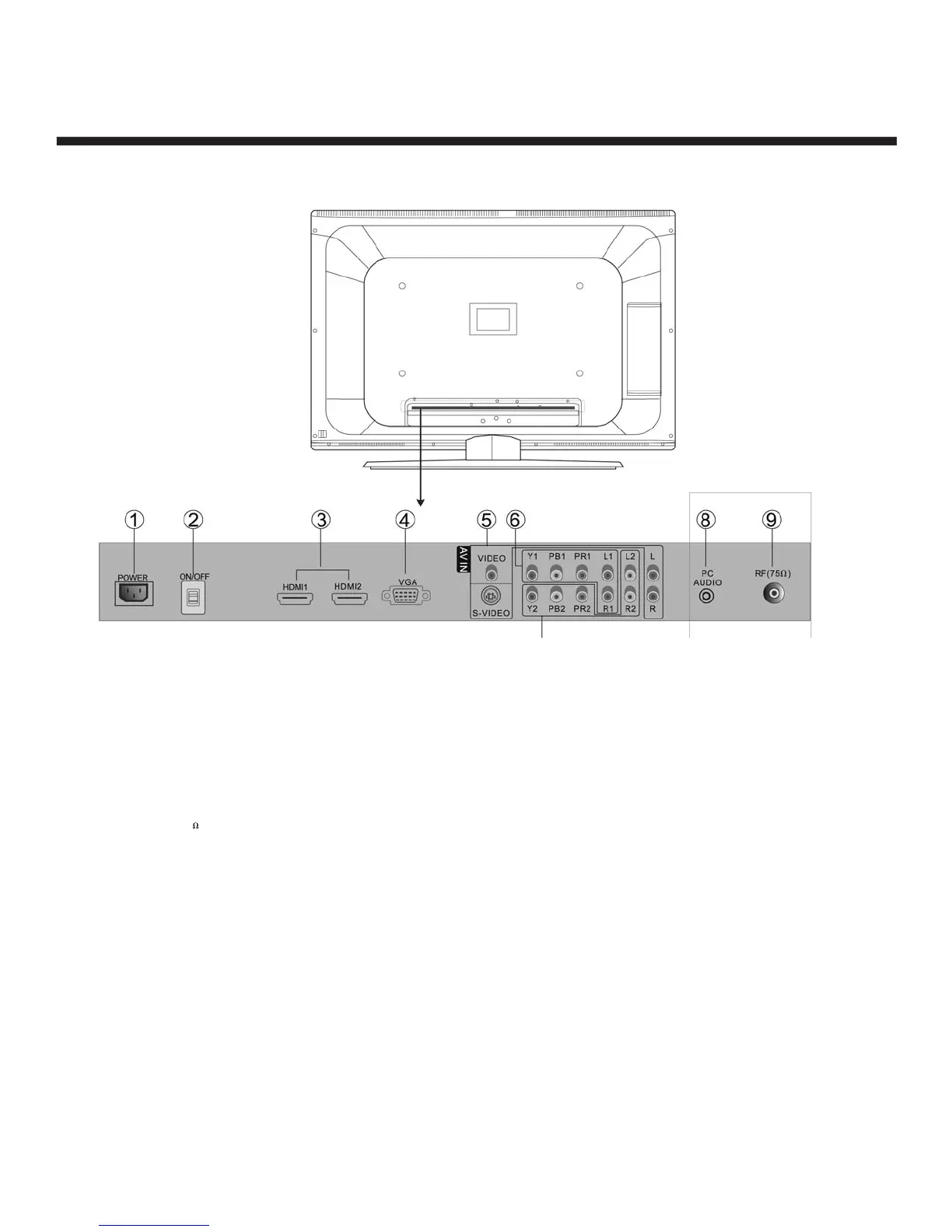 9. RF (75 ) : Antenna /closed circuit TV network port (75 ohm VHF/UHF)
