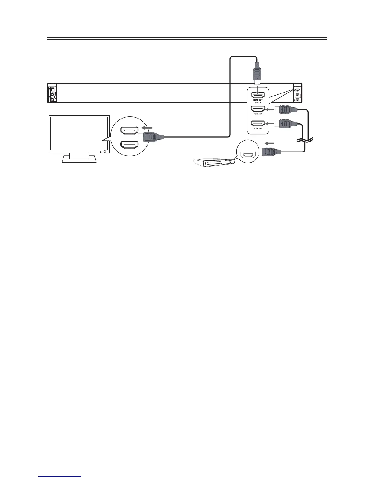 1. Use an HDMI cable (not included) to connect the main unit HDMI OUT socket to the TV’s HDMI IN