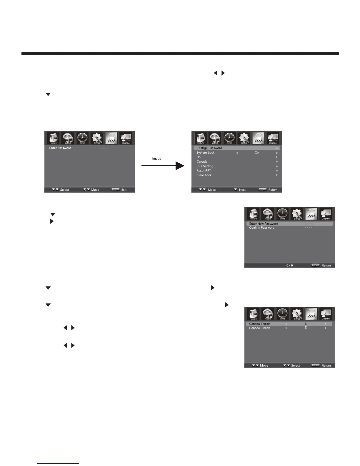Use the button to enter the “Enter Password” selection and use the numeric buttons to input a 4-digit