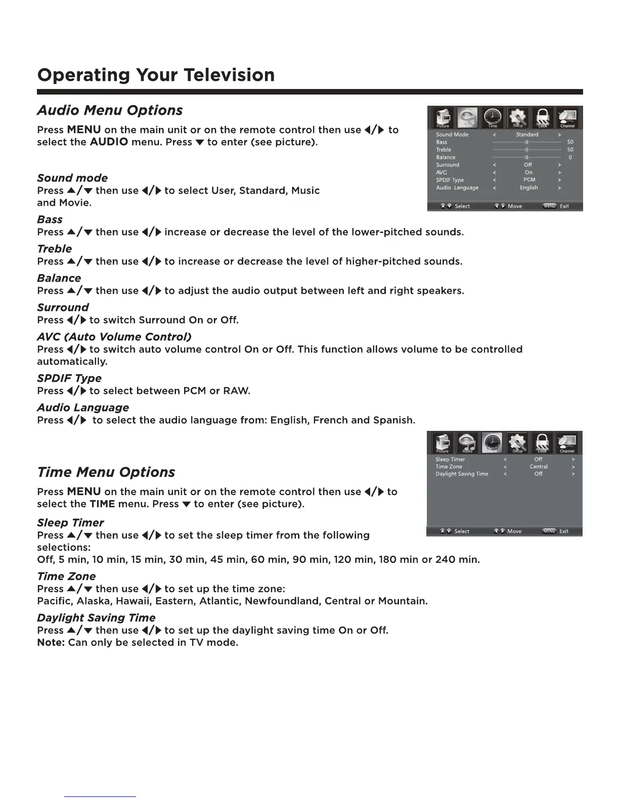 Fluid FLD4800 - Operating Your Television; Audio Menu Options; Time Menu Options