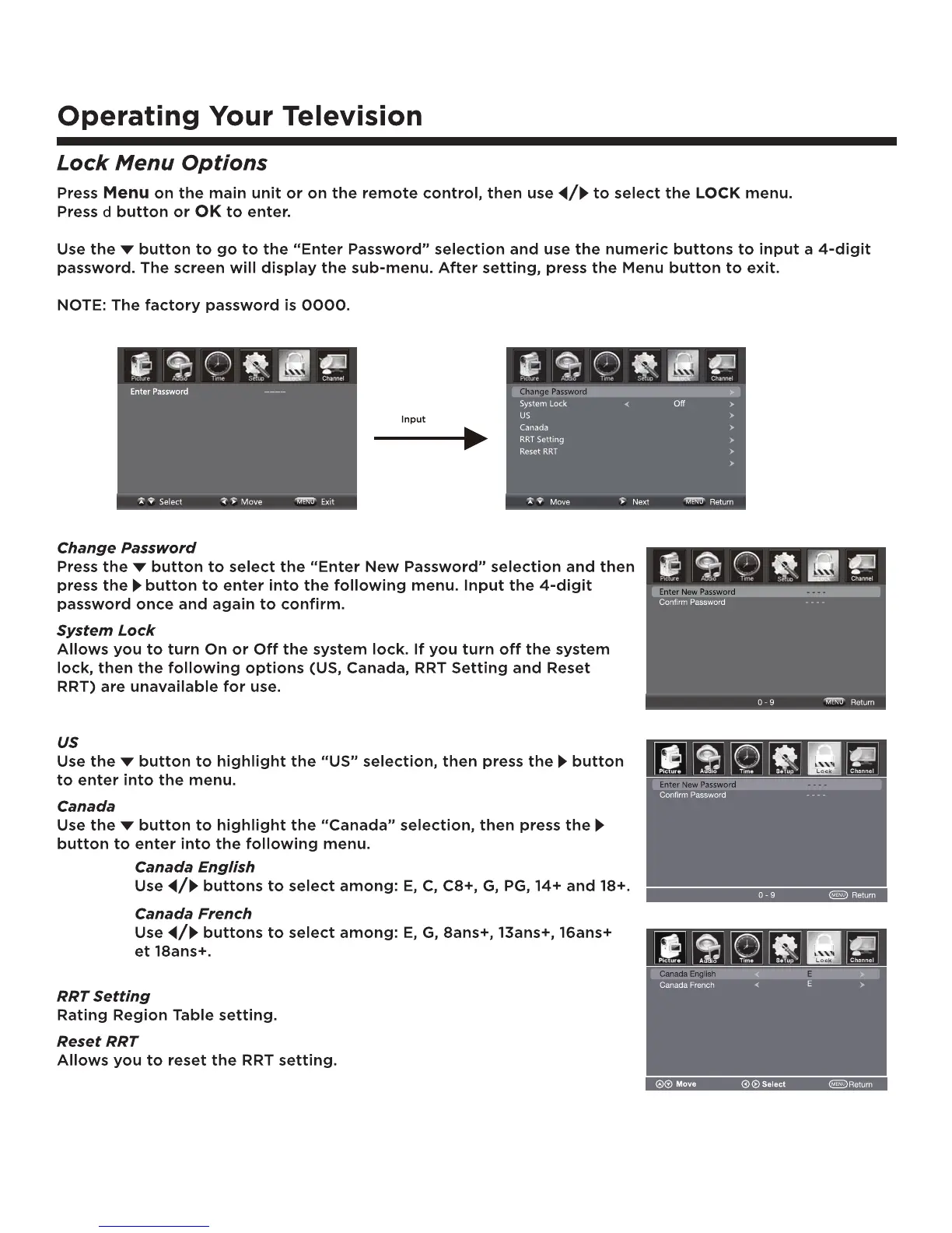 lock, then the following options (US, Canada, RRT Setting and Reset