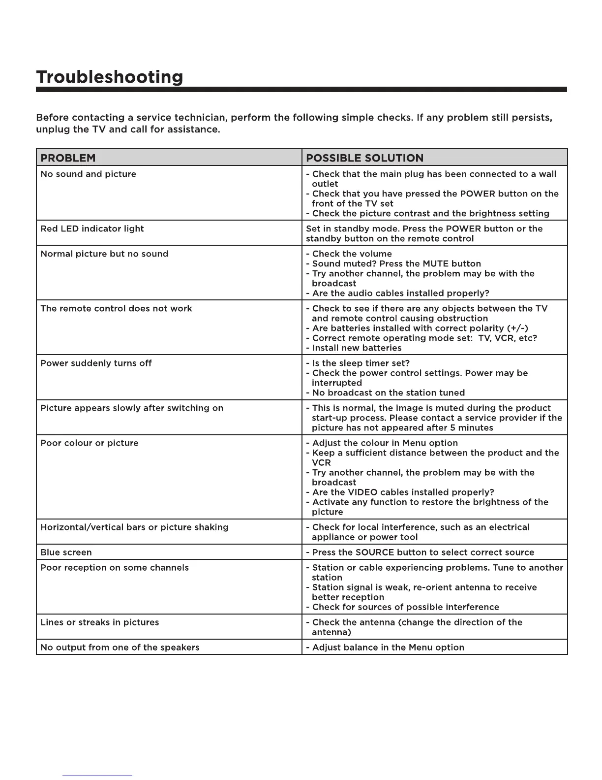 The remote control does not work - Check to see if there are any objects between the TV