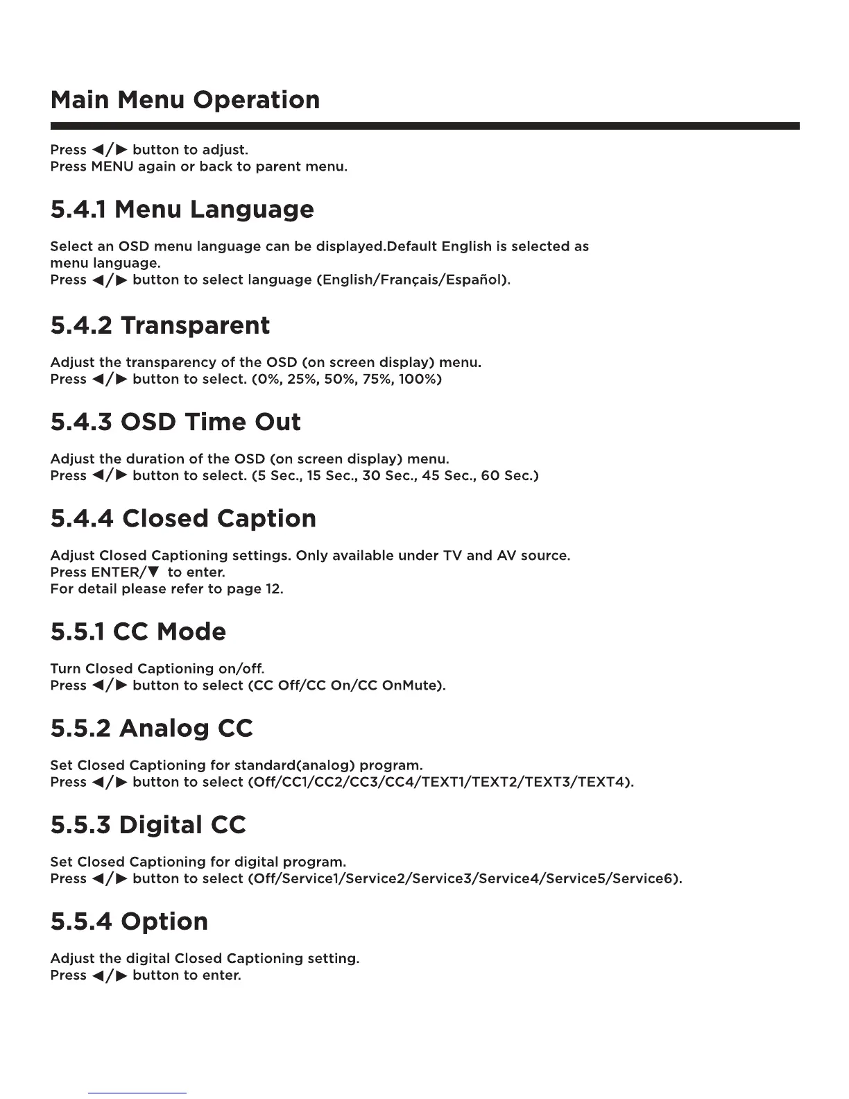 Fluid FLD5501 - Menu Language; Transparent; OSD Time out; CC Mode