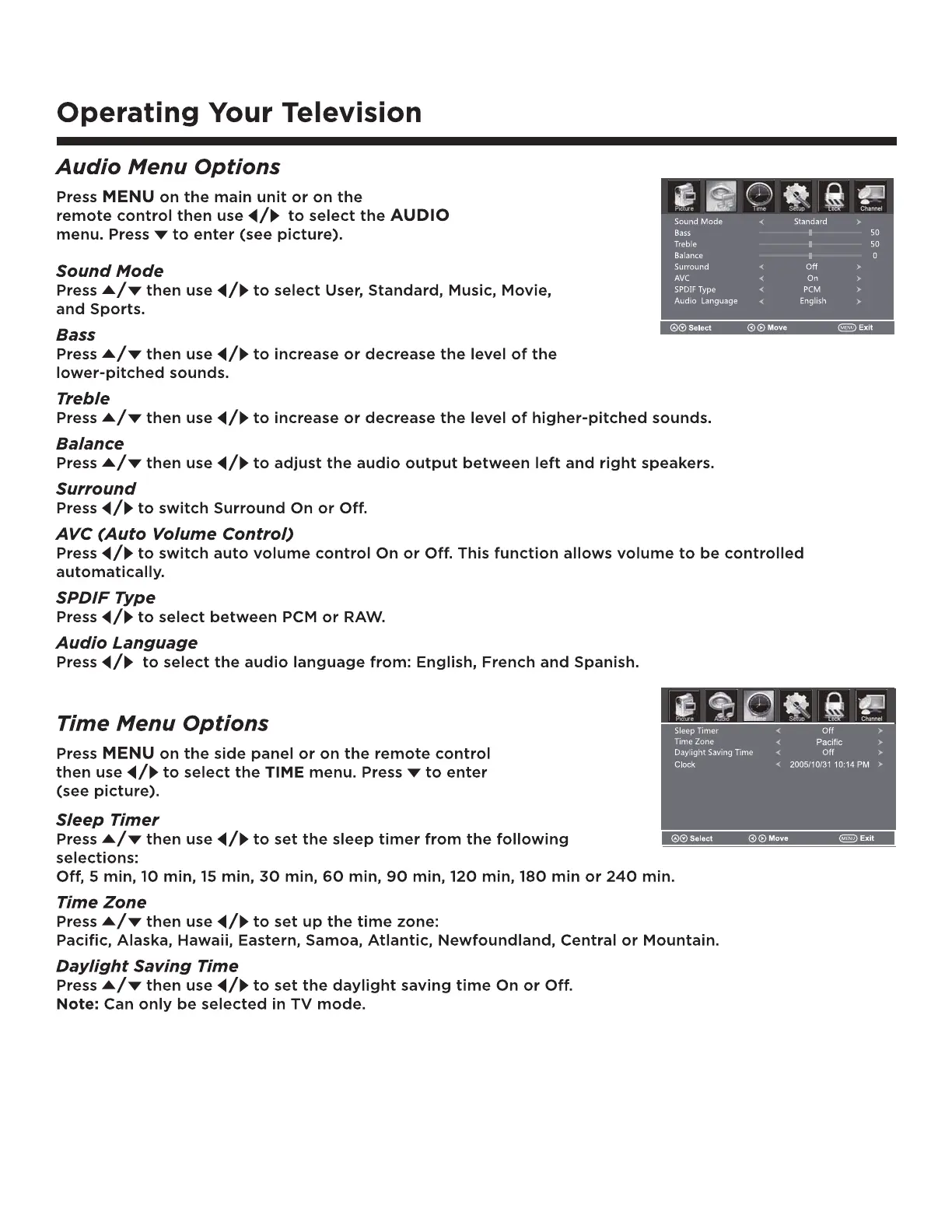Fluid FLDC2802 - Audio Menu Options; Time Menu Options