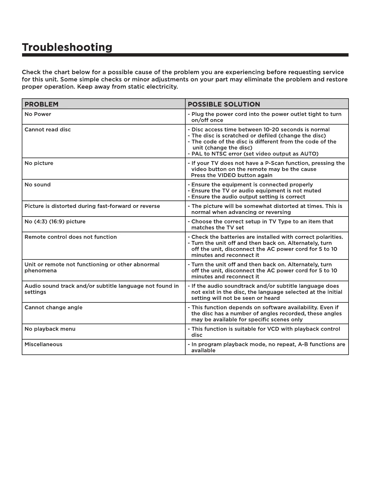 Check the chart below for a possible cause of the problem you are experiencing before requesting service
