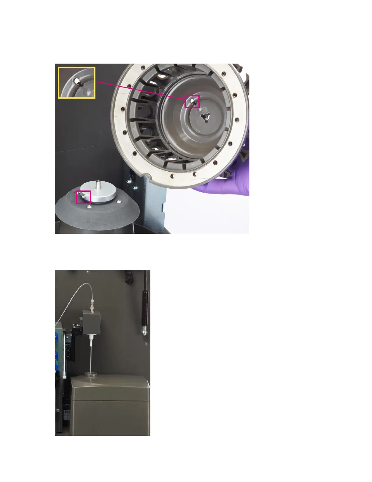 8 Tilt the probe line stir assembly back to its vertical position over the carousel assembly.