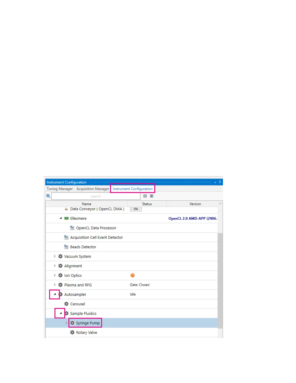 Configuration > Autosampler > Sample Fluidics, expand, and then click Syringe Pump.