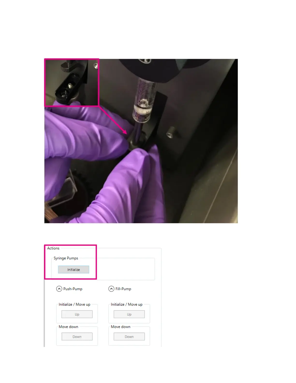 16 Initialize the fill-pump and push-pump. Under Actions > Syringe Pumps, click Initialize.