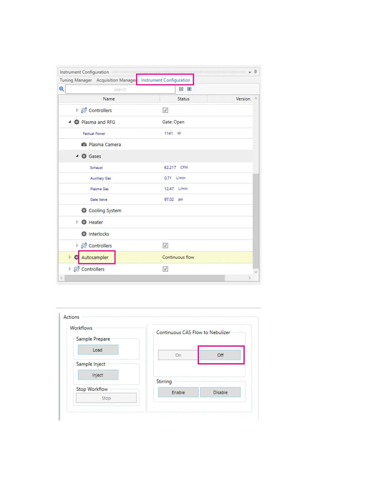 2 In the Autosampler tab under the Actions > Continuous CAS Flow to Nebulizer, click Off.