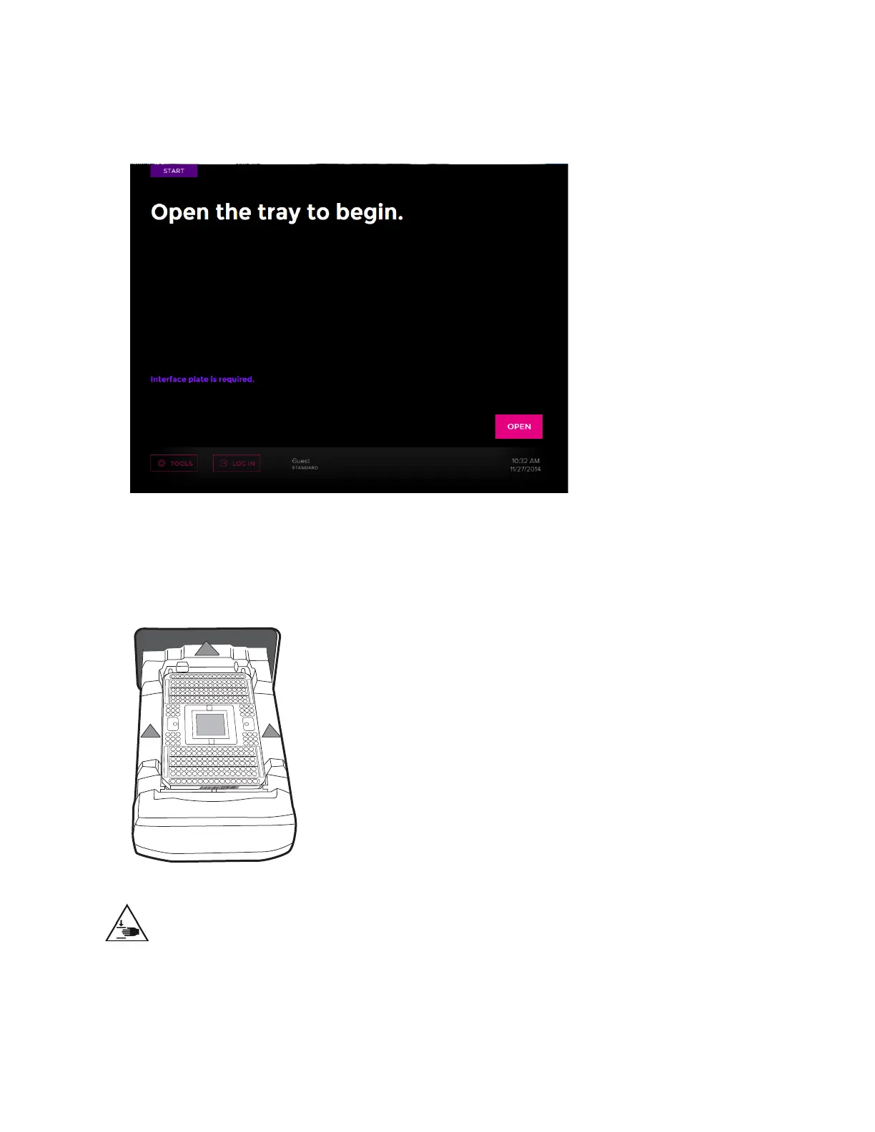 CAUTION PINCH HAZARD. The instrument door and tray can pinch your hand.