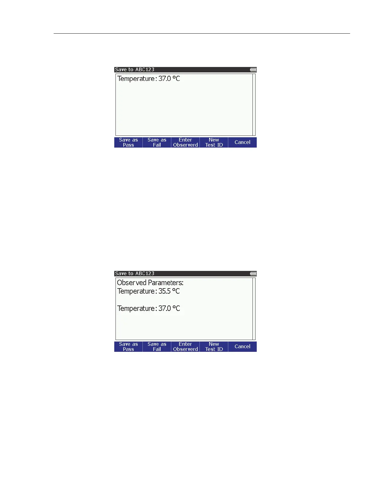 as Pass or the Save as Fail softkey. The save screen in Figure 55 shows on