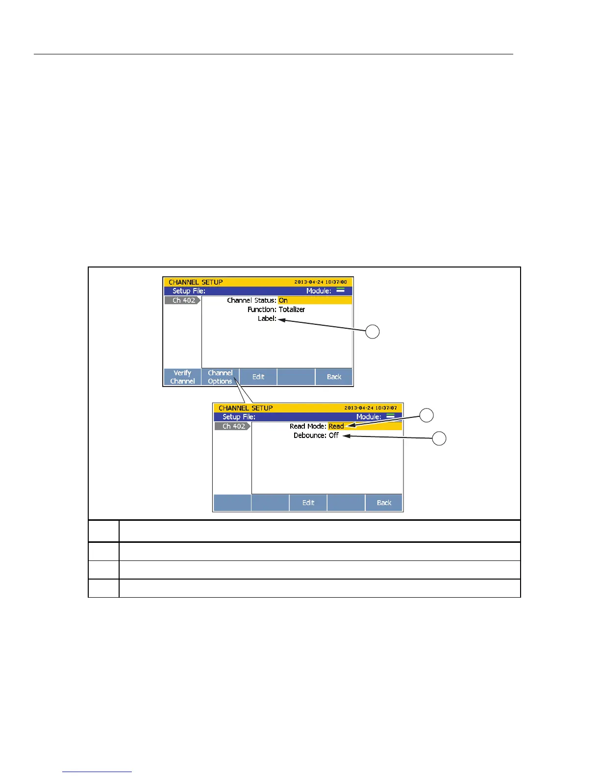 3. Use the information in Table 3-9 to configure the totalizer channel. Push or to