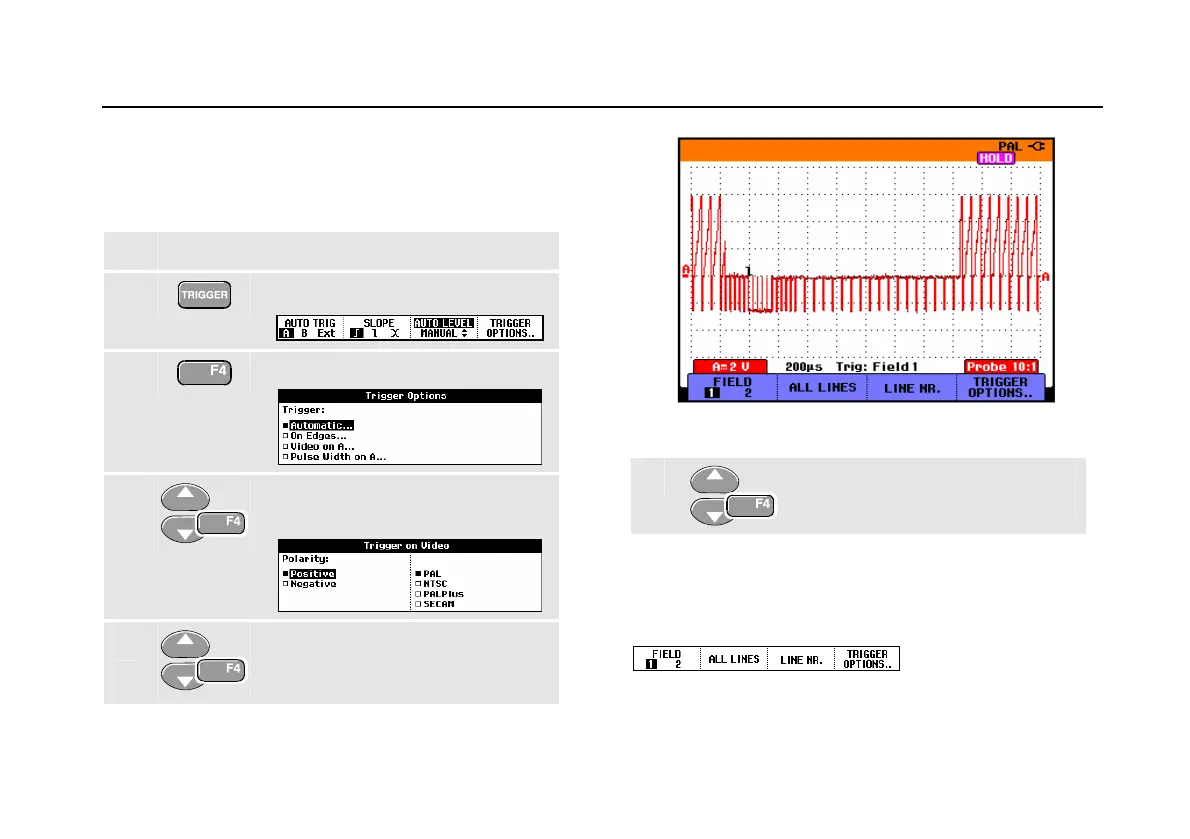 To trigger on a video signal, first select the standard of the