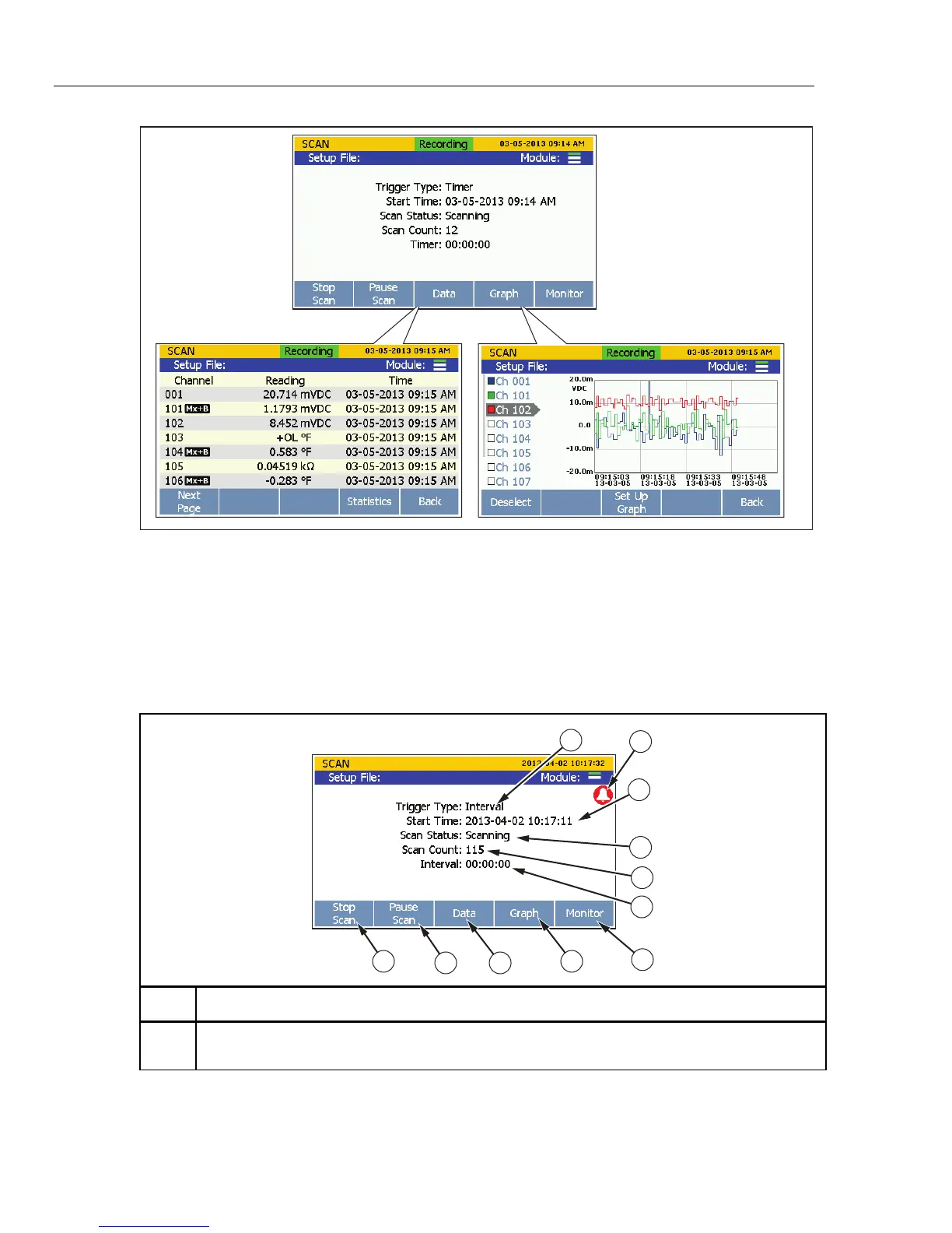 The Scan menu lets the user control the scan and view the scan data. The Scan menu also