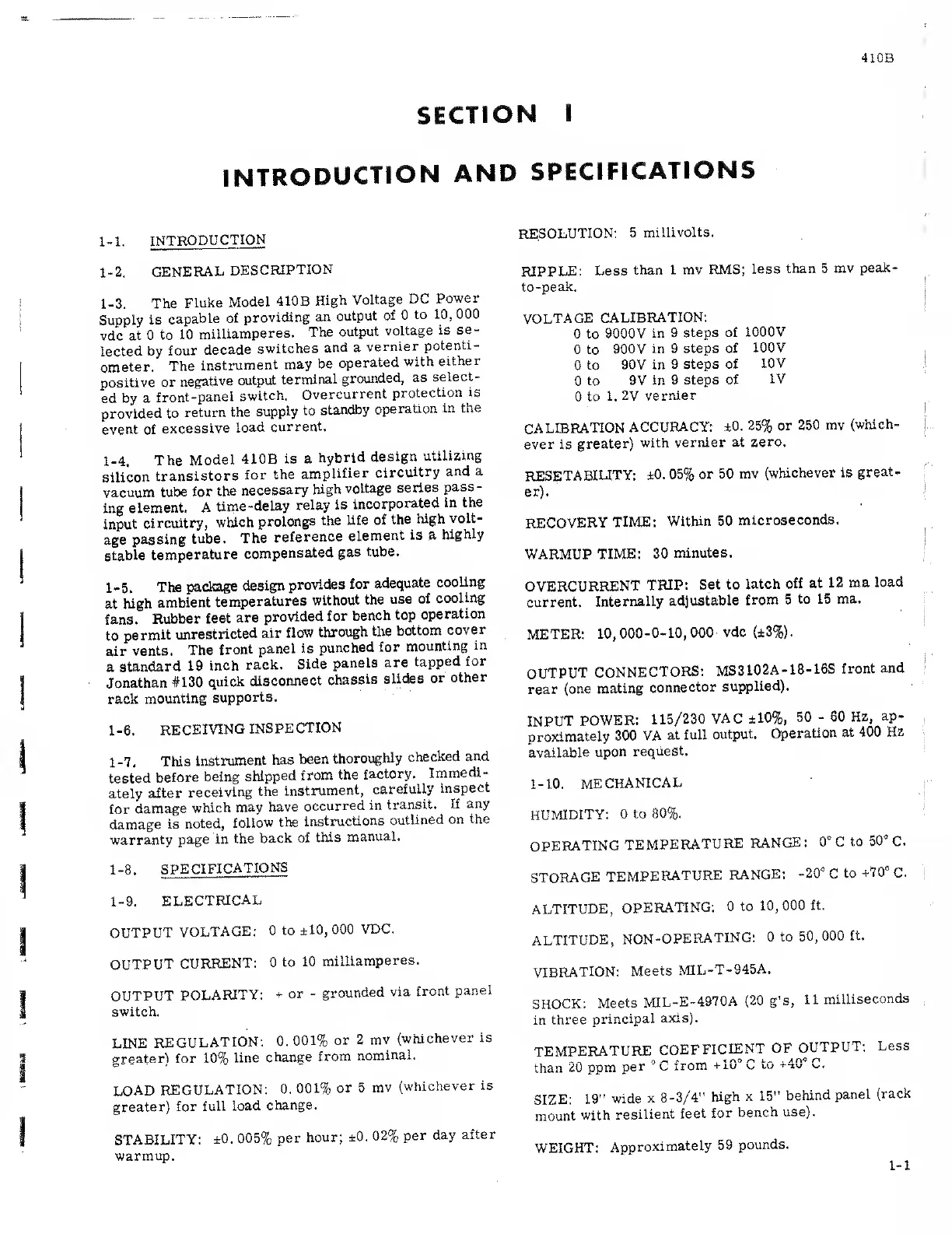 Fluke 410B - General Description; Receiving Inspection; Specifications; Electrical