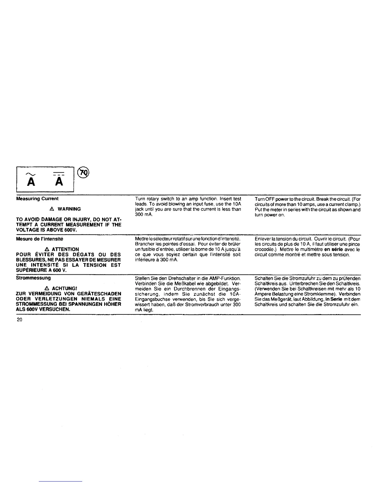 Fluke 75 - Current Measurement; Connecting for Current Measurements; Terminal Fuse Protection
